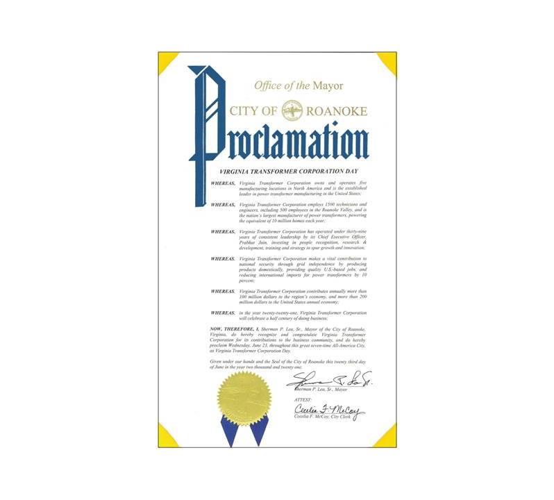 - City of Roanoke declares June 23rd as Virginia Transformer Corporation Day